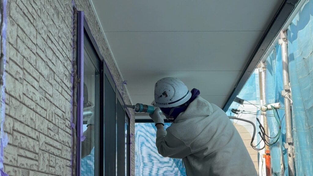 目地にシーリング材を均一に充填させます。防水性や耐久性が向上させるために隙間なくしっかり充填することが重要です。
